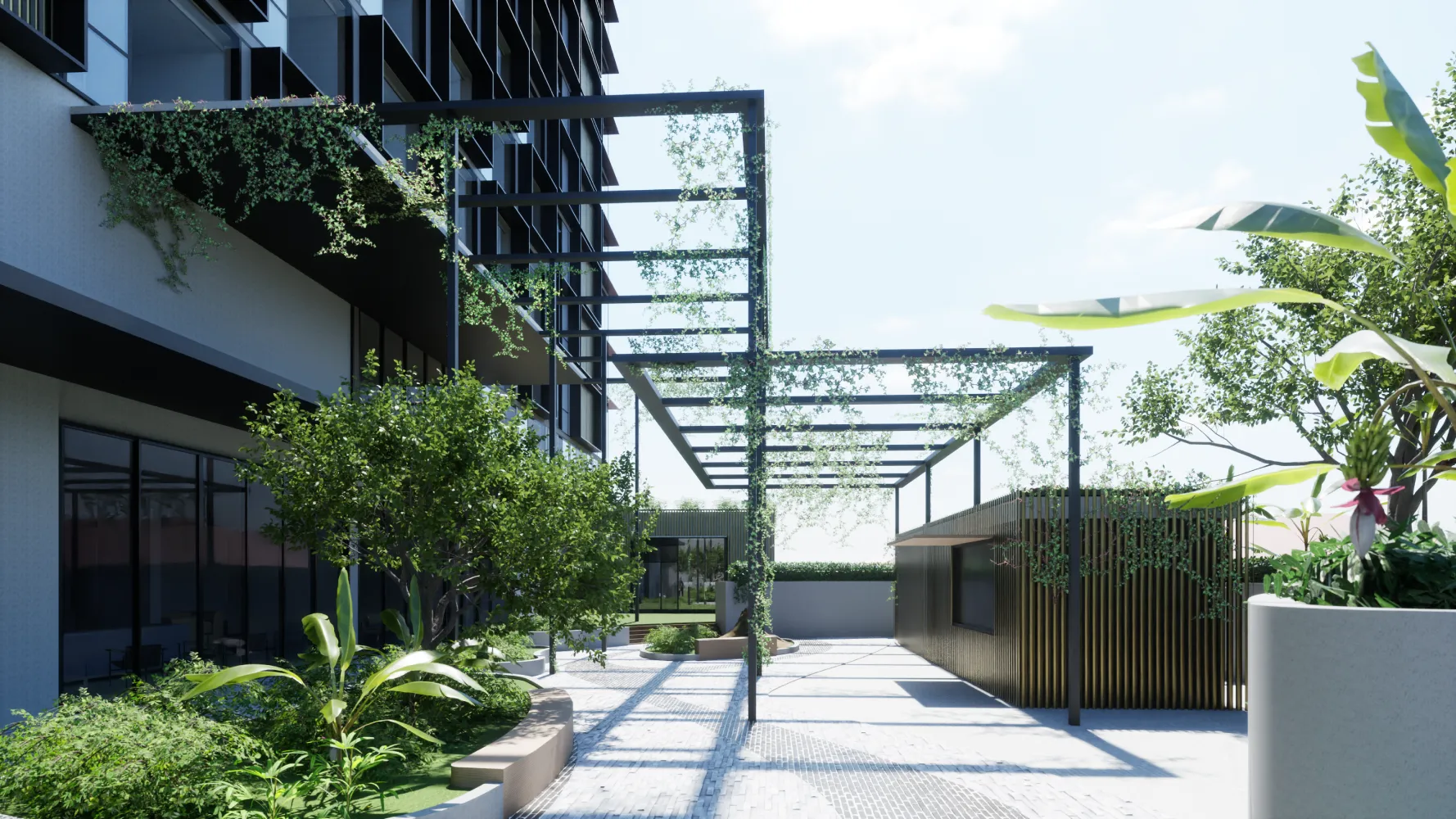 Entry canopies have been refined with a form that echoes the simplicity of the building itself, by providing a mixture of hard and soft shading elements. Vertical structural elements are embedded within planters (where possible), with the open framed components used as a structure to support natural vegetation. This integrates the built form with the landscape.