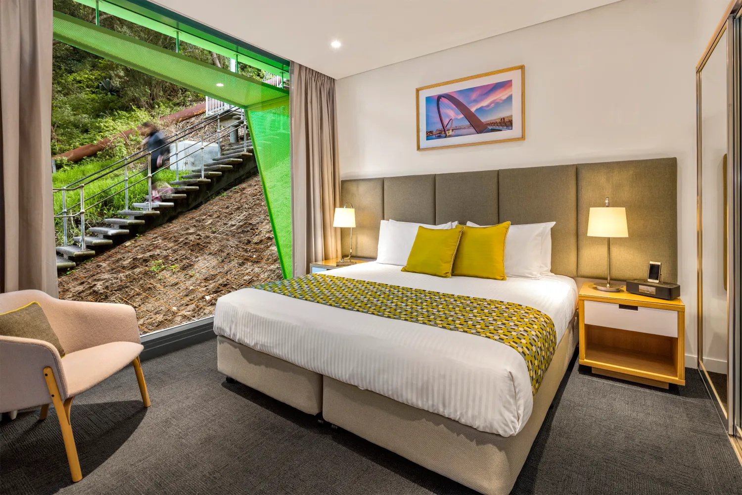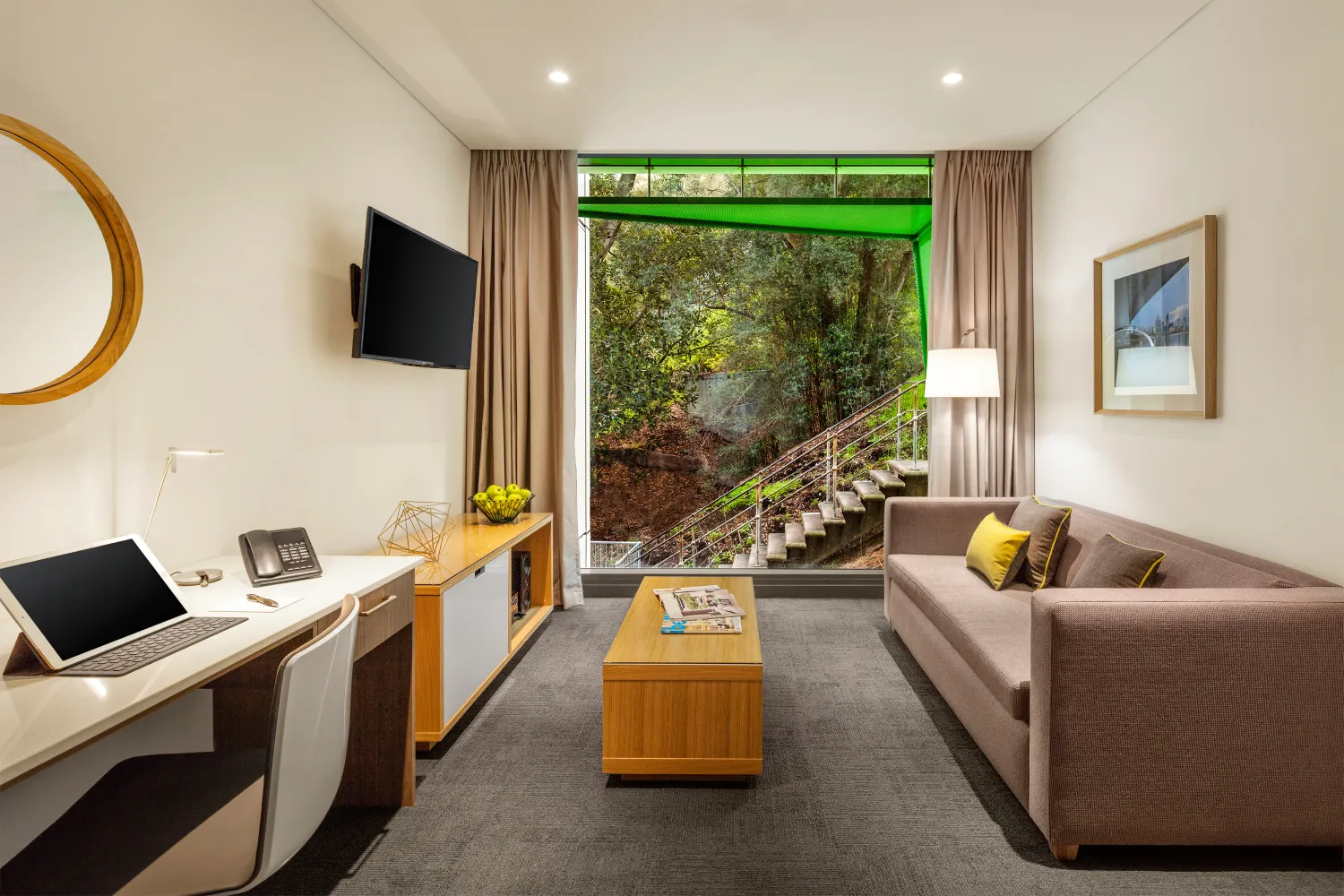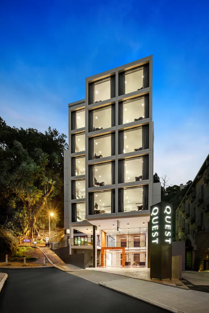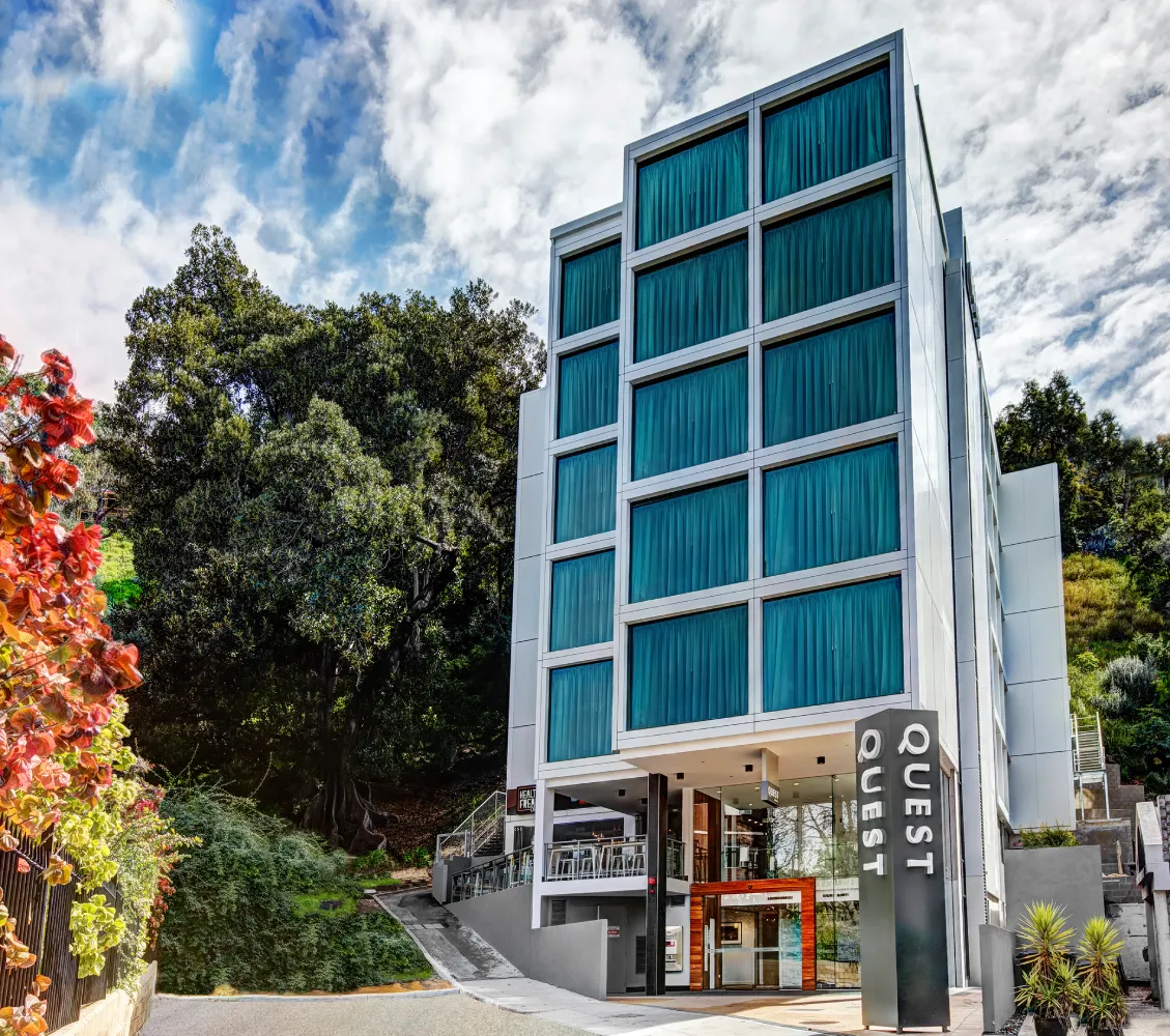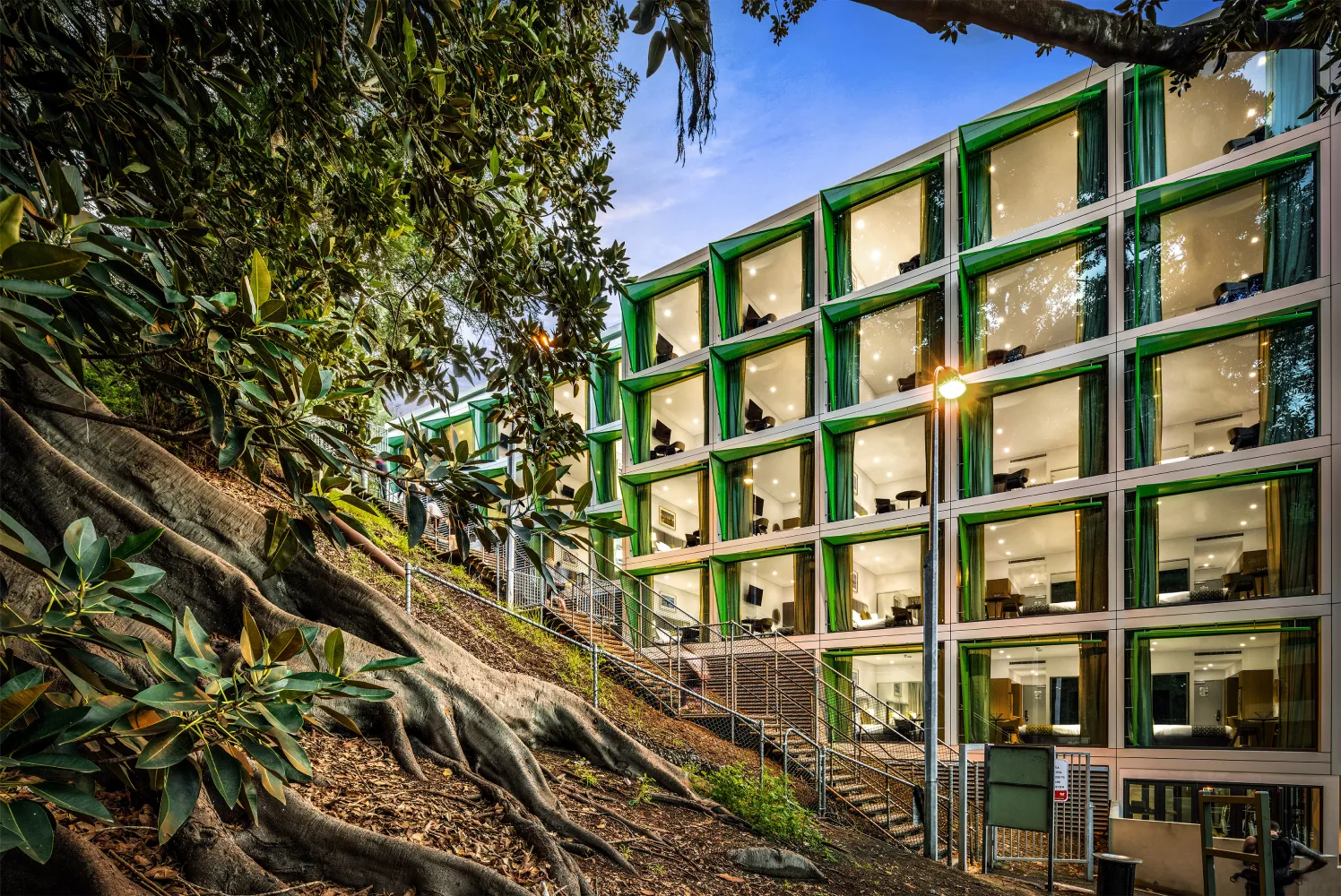 We felt it important to maintain a traditional sense of streetscape at pavement level.The landscaped forecourt,sited at the junction of Jacob’s Ladder and Cliff Street providesa hard landscaped, double volume covered pedestrian access to the primary hotel entry lobby whilst at the same time provides an attractive and engaging public space adjacent to the café.This is effectively a pedestrian realm defined by the huge projecting Moreton Bay Fig tree and the rising escarpment and stairway to the rear.