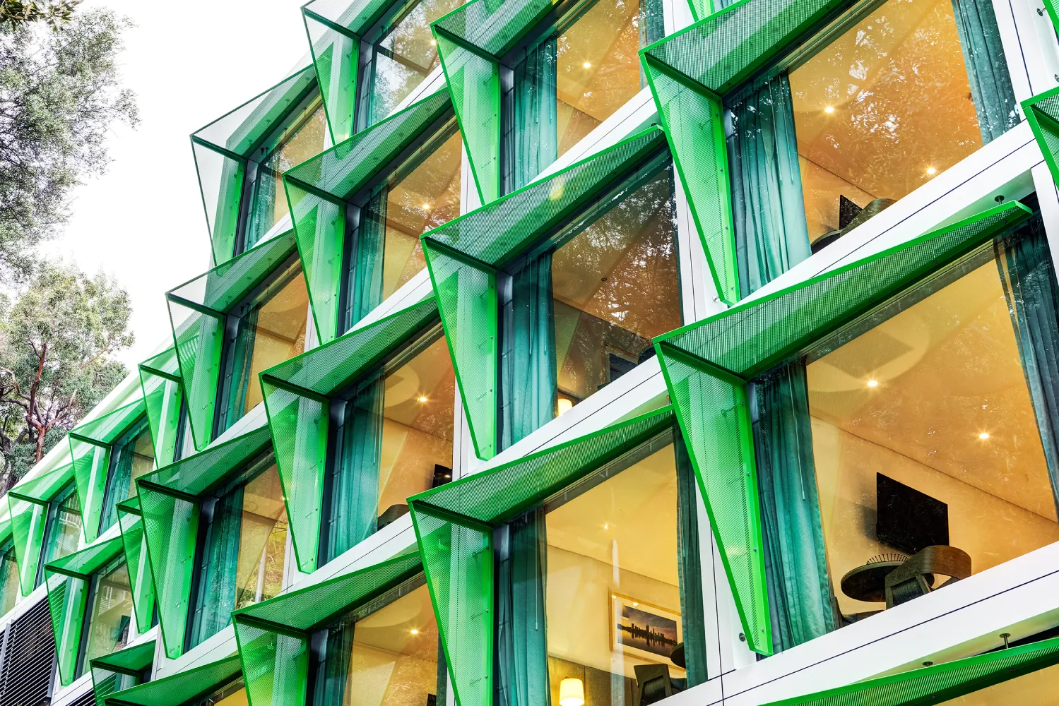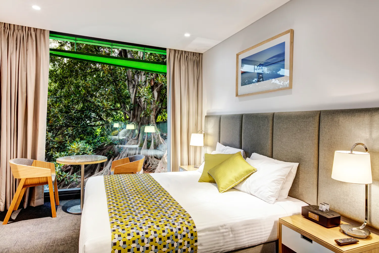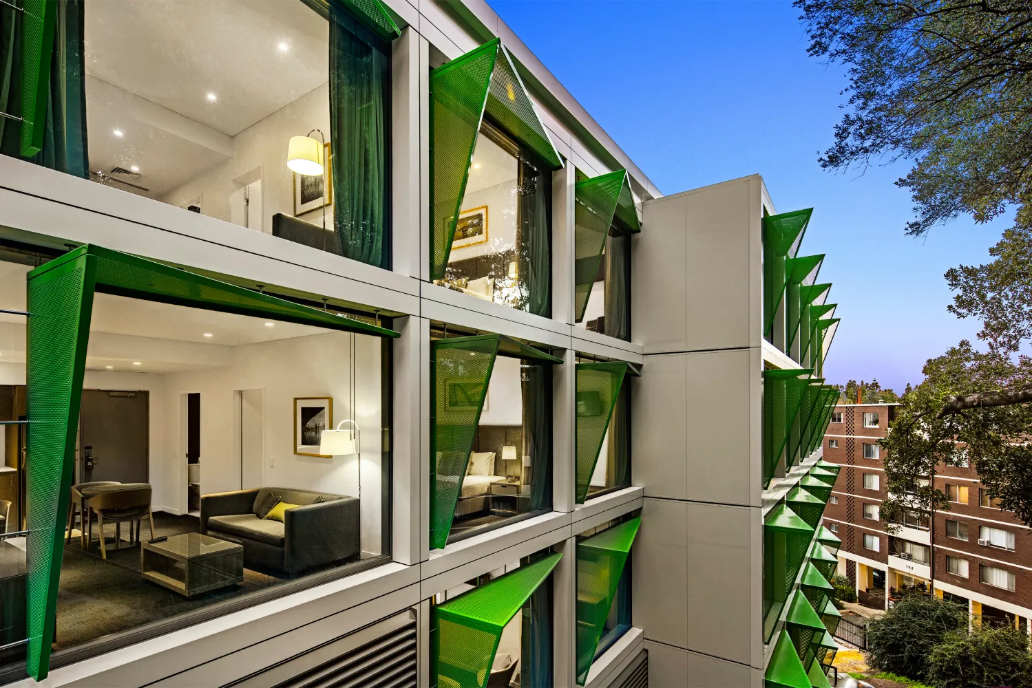 The street level café provides reinforcement of streetscape and public domain; it services the needs of the local commercial and residential communities and contributes to the amenity of the hotel’s occupants.The al fresco seating adjacent to the footpath and in close proximity to the large Moreton Bay Fig tree provides a cosmopolitan interface with the street.