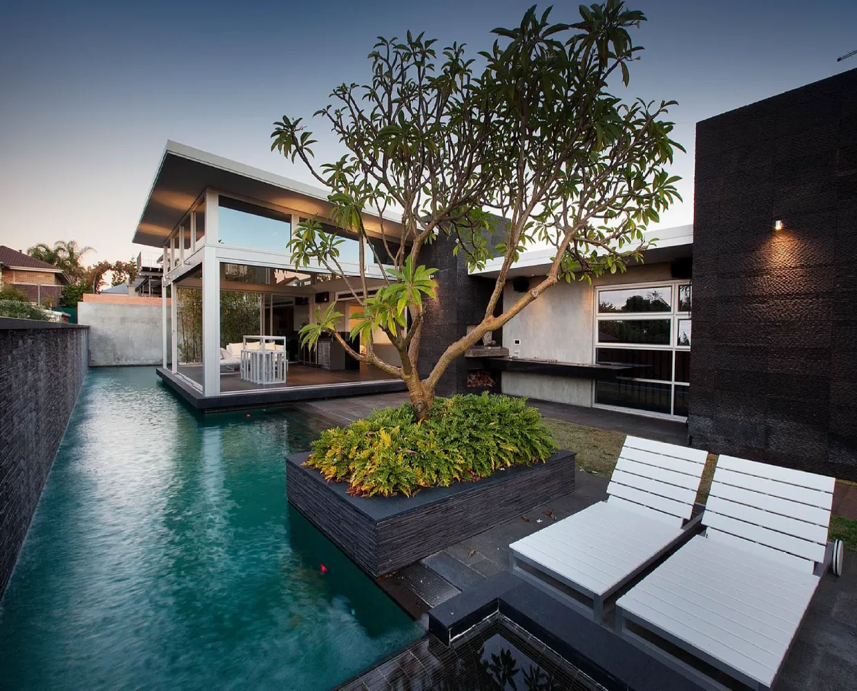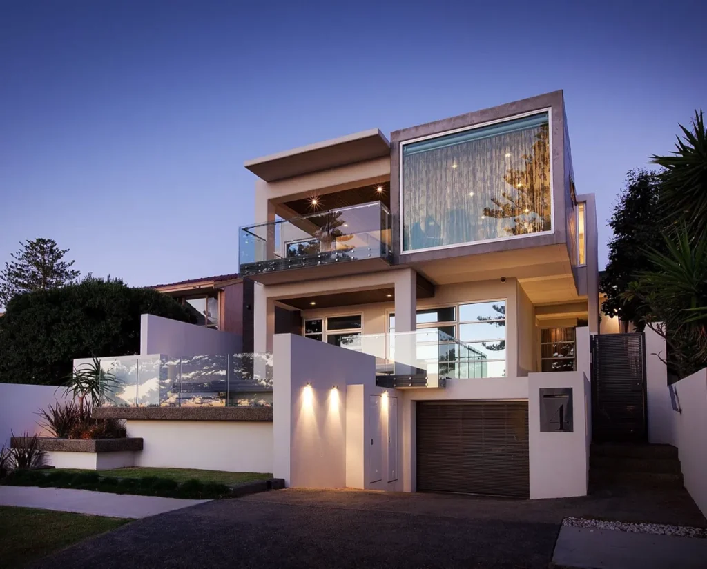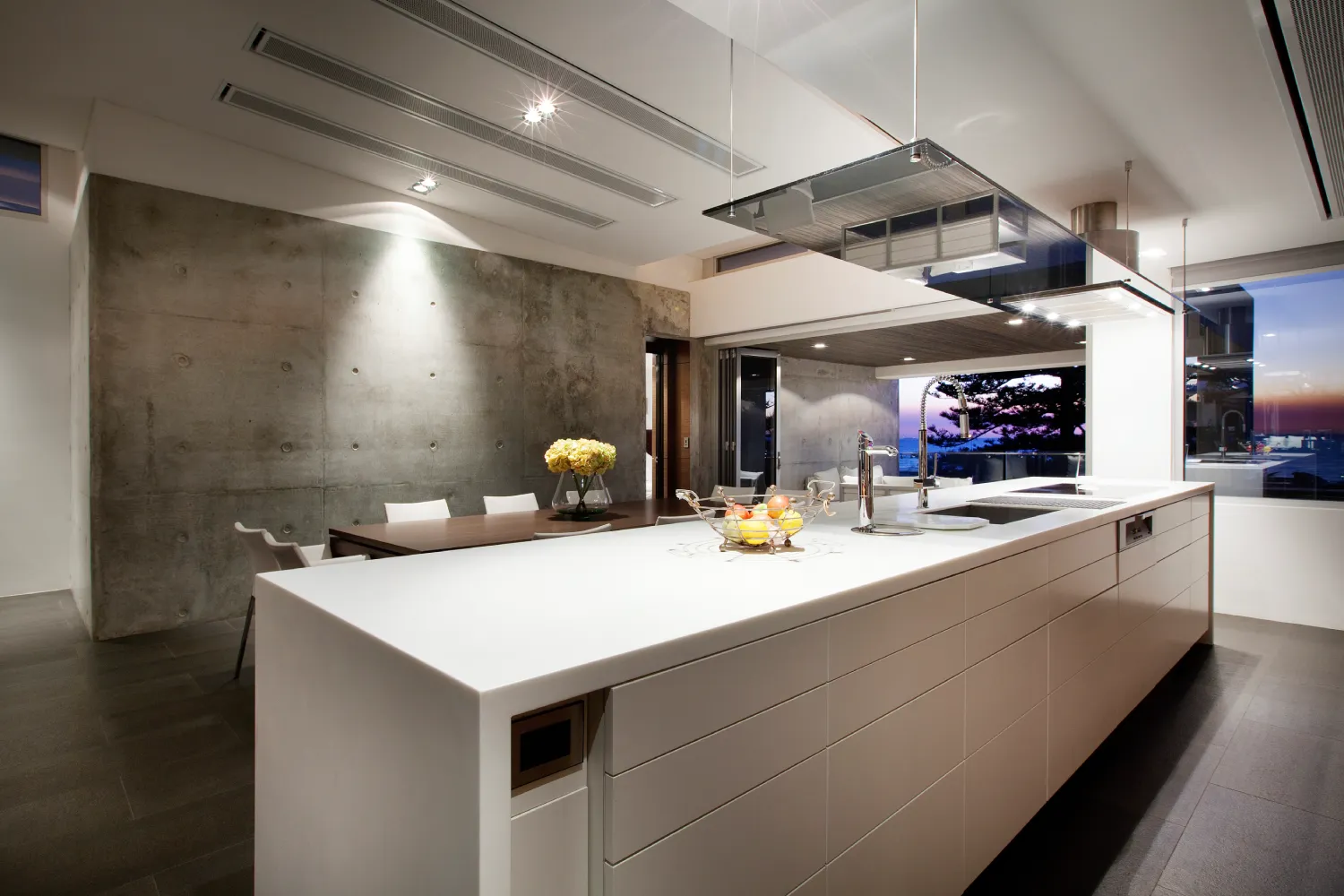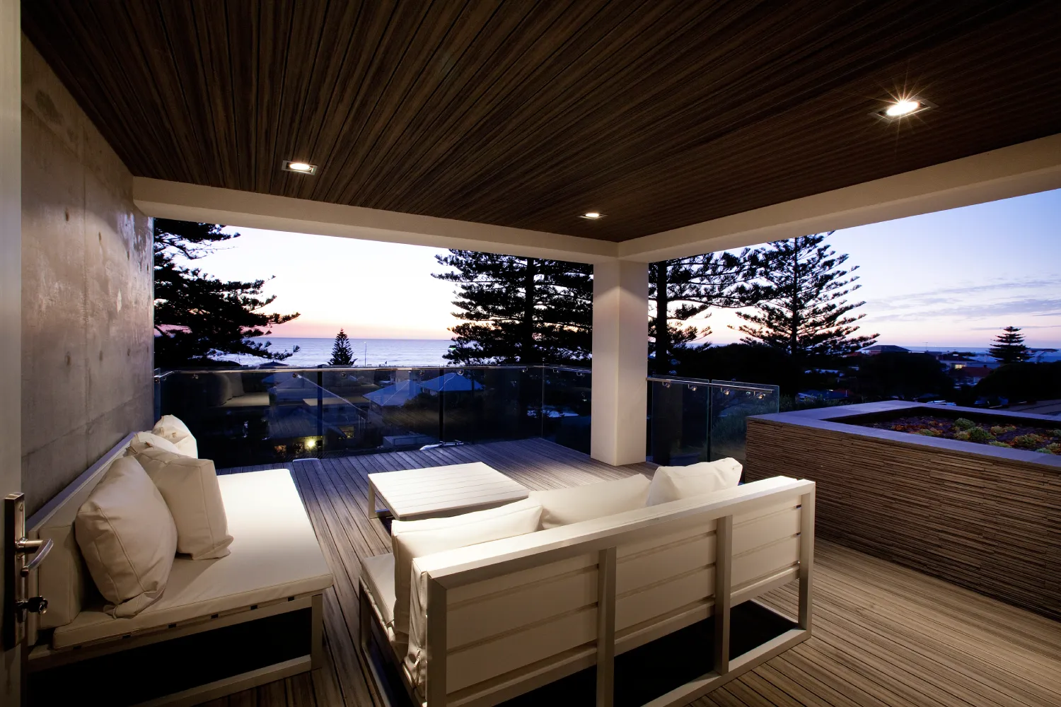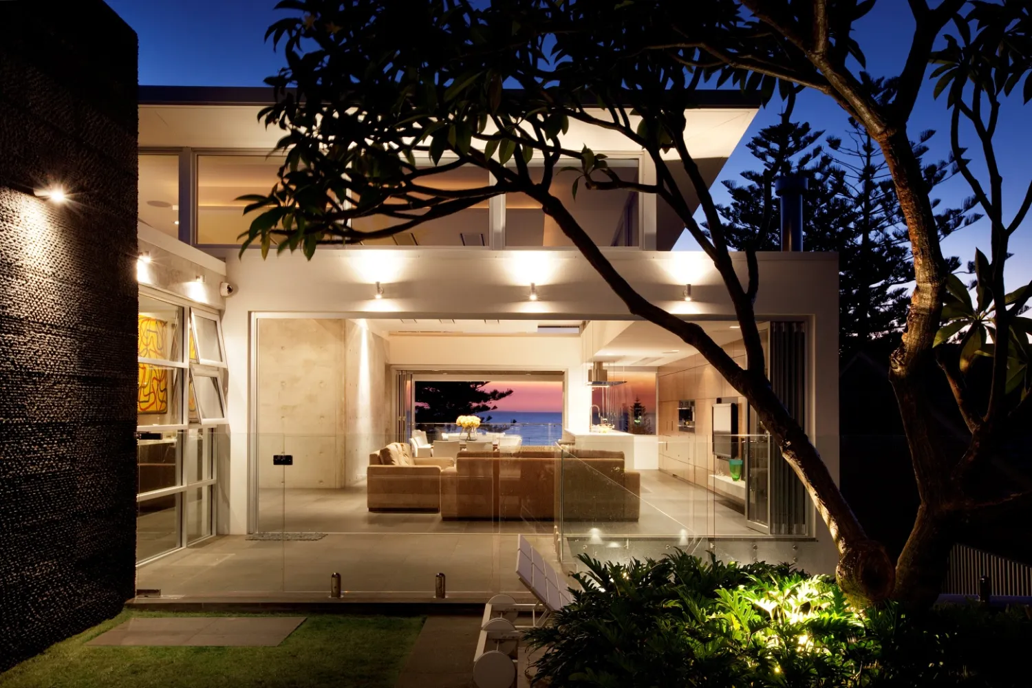 A restrained material palette anchors the design in textural, enduring finishes. Off-form concrete walls provide structural expression and thermal mass, their raw surface quality contrasted by warm timber panelling and natural stone floors that flow seamlessly between interior and exterior zones. Central to the spatial planning is a sheltered courtyard that acts as the home’s organisational heart, linking living areas vertically and horizontally whilst creating a protected microclimate for the pool and alfresco spaces. This courtyard strategy mitigates harsh coastal elements prevailing sea breezes and salt exposure enabling year-round outdoor living. Frameless glass balustrades and feature lighting enhance the contemporary aesthetic whilst preserving sightlines, culminating in a residence that embodies refined coastal modernism tailored to Western Australian conditions.