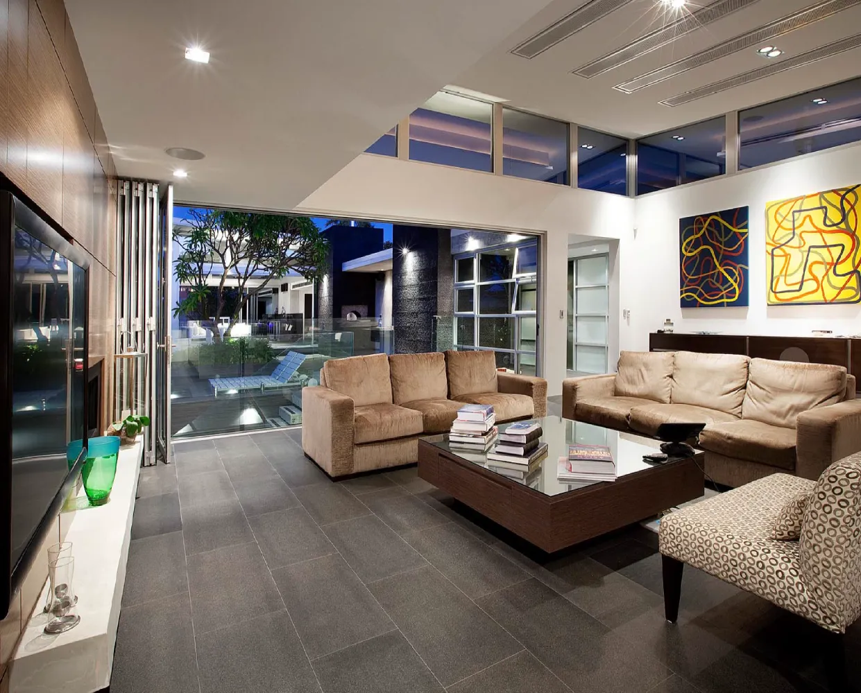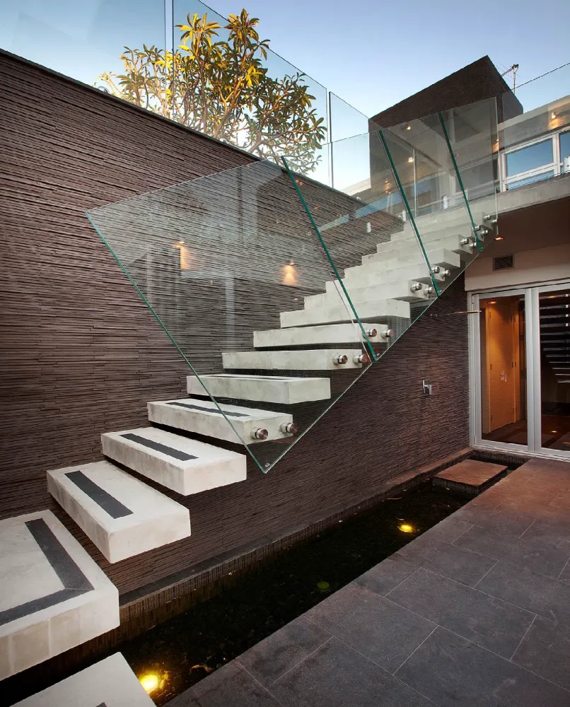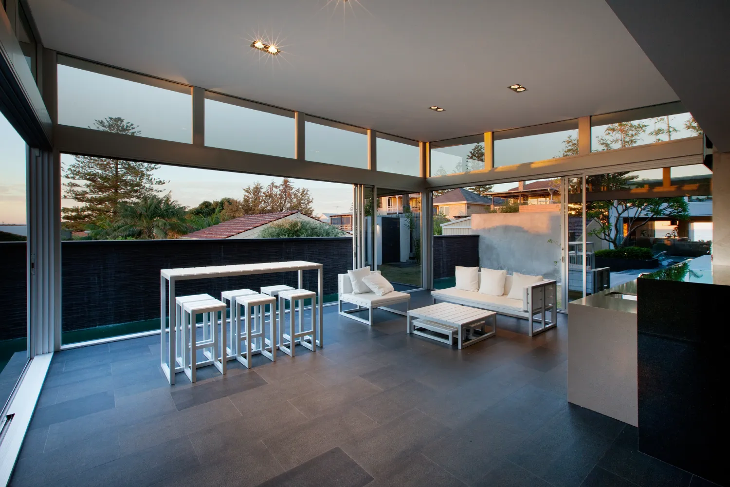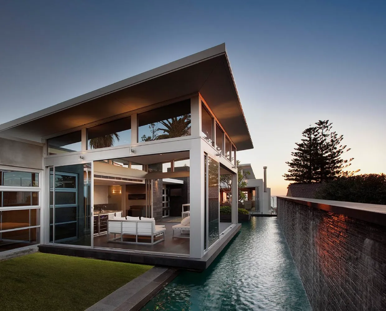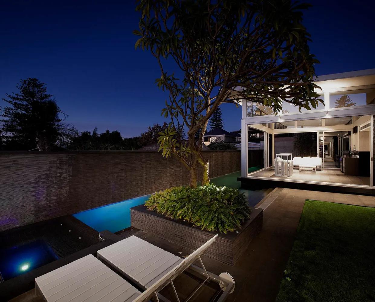 A restrained material palette anchors the design in textural, enduring finishes. Off-form concrete walls provide structural expression and thermal mass, their raw surface quality contrasted by warm timber panelling and natural stone floors that flow seamlessly between interior and exterior zones. Central to the spatial planning is a sheltered courtyard that acts as the home’s organisational heart, linking living areas vertically and horizontally whilst creating a protected microclimate for the pool and alfresco spaces. This courtyard strategy mitigates harsh coastal elements prevailing sea breezes and salt exposure enabling year-round outdoor living. Frameless glass balustrades and feature lighting enhance the contemporary aesthetic whilst preserving sightlines, culminating in a residence that embodies refined coastal modernism tailored to Western Australian conditions.