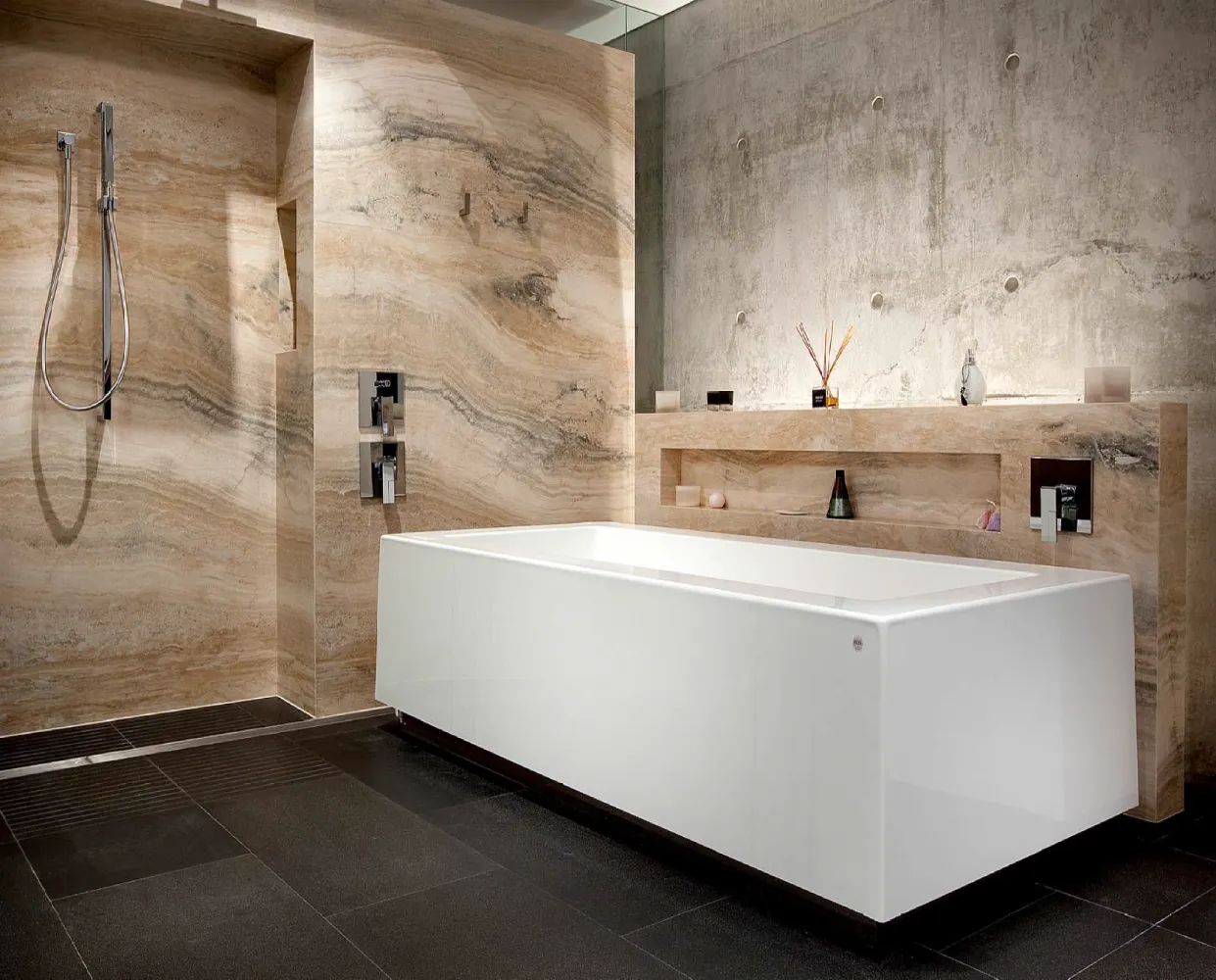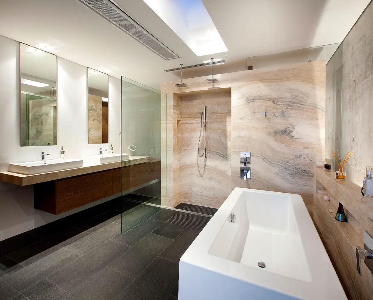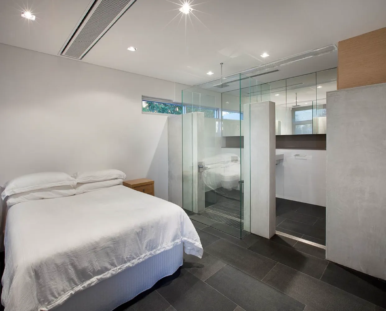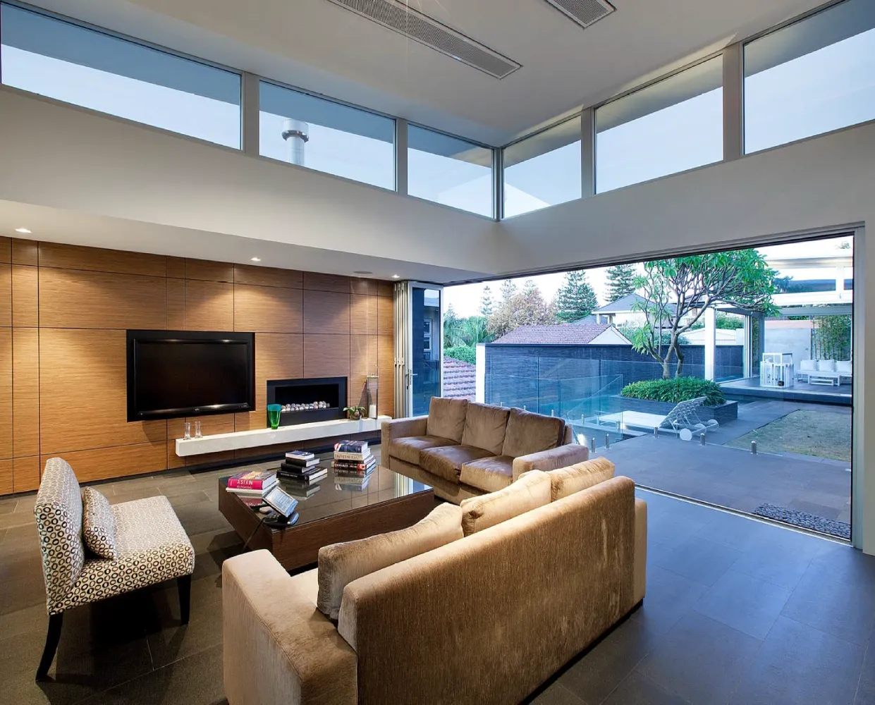 A restrained material palette anchors the design in textural, enduring finishes. Off-form concrete walls provide structural expression and thermal mass, their raw surface quality contrasted by warm timber panelling and natural stone floors that flow seamlessly between interior and exterior zones. Central to the spatial planning is a sheltered courtyard that acts as the home’s organisational heart, linking living areas vertically and horizontally whilst creating a protected microclimate for the pool and alfresco spaces. This courtyard strategy mitigates harsh coastal elements prevailing sea breezes and salt exposure enabling year-round outdoor living. Frameless glass balustrades and feature lighting enhance the contemporary aesthetic whilst preserving sightlines, culminating in a residence that embodies refined coastal modernism tailored to Western Australian conditions.