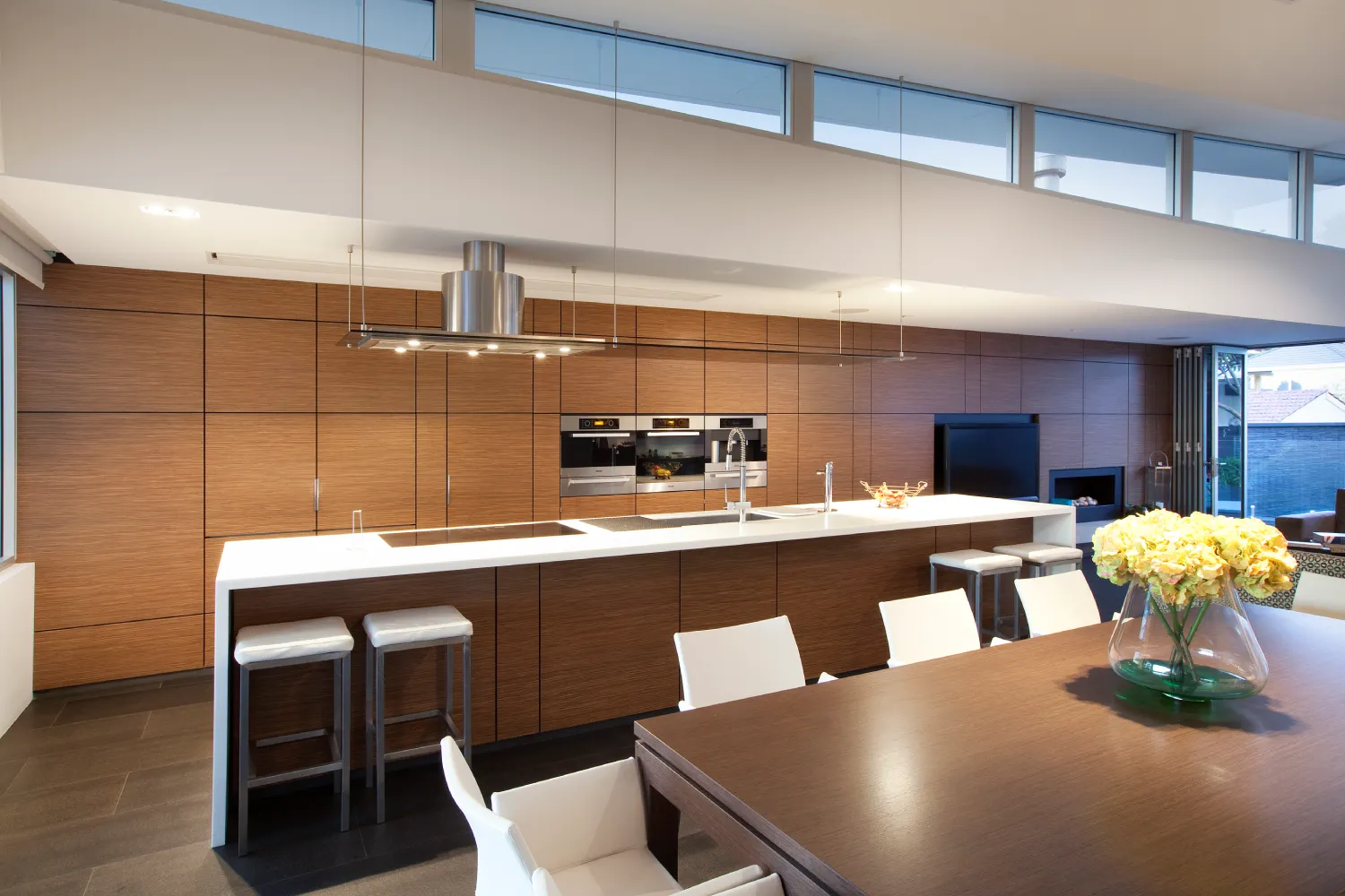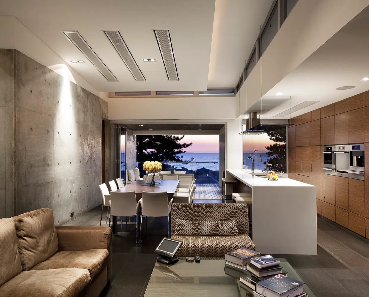 This modernist, two level residence rises up a sloping site to take in coastline views, offering comfortable family living. The project uses a textured material pallet of off-form concrete, timber panelling and stone tiled floors.