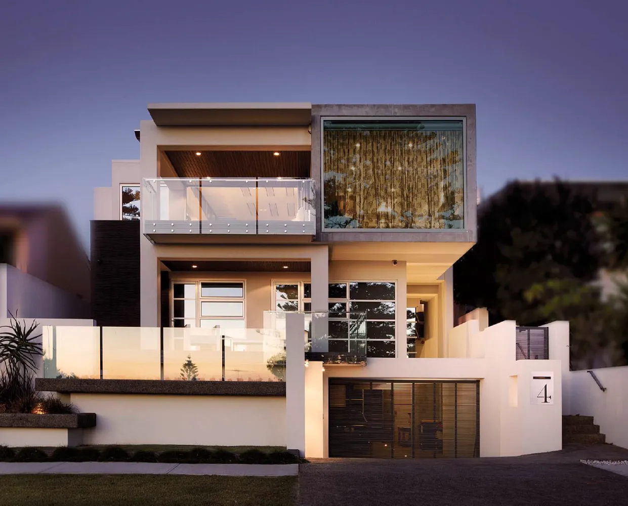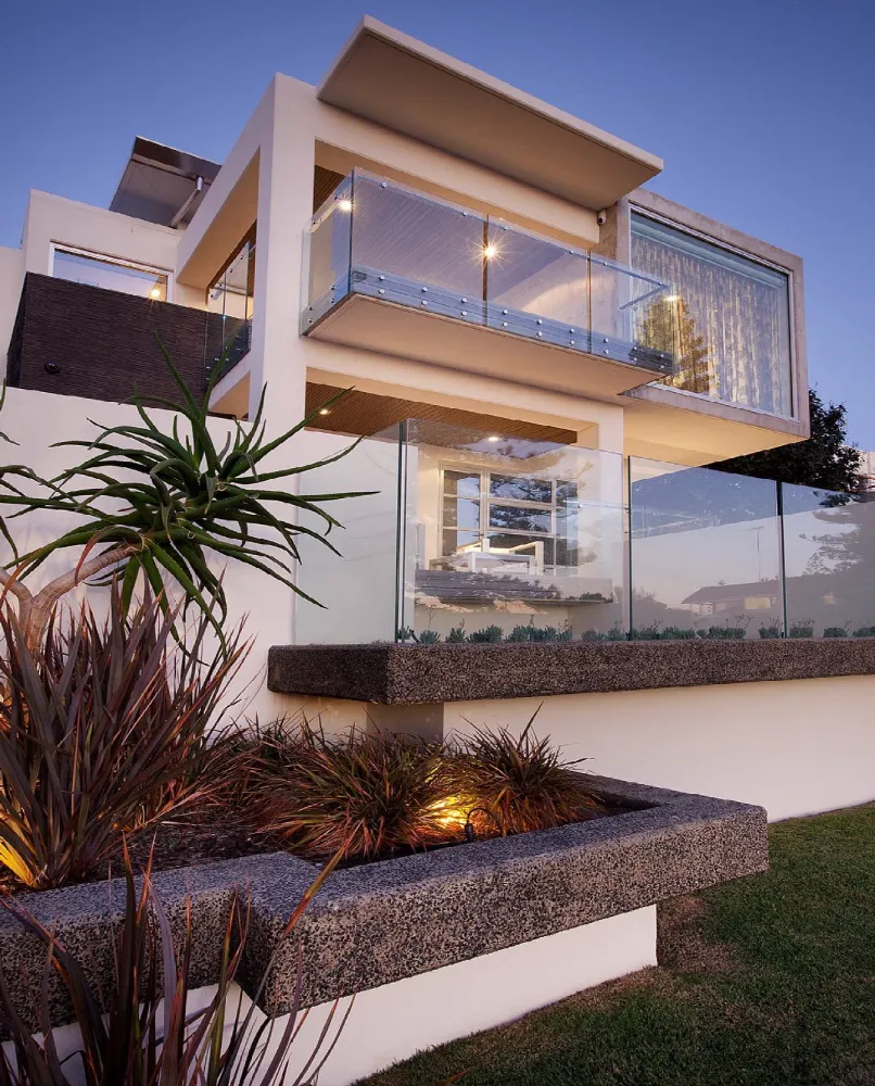 This modernist two-level residence negotiates a sloping coastal site through a carefully articulated series of platforms and terraces, rising strategically to capture expansive Indian Ocean views. The architectural composition employs crisp geometric forms and layered horizontal planes that respond to the topography whilst maximising visual connections to the coastline. Living spaces are oriented to frame ocean vistas, with generous glazing and cantilevered upper-level volumes creating a strong dialogue between built form and natural landscape. The design balances openness with privacy, utilising strategic screening and level changes to mediate between public street frontage and intimate family living spaces.
